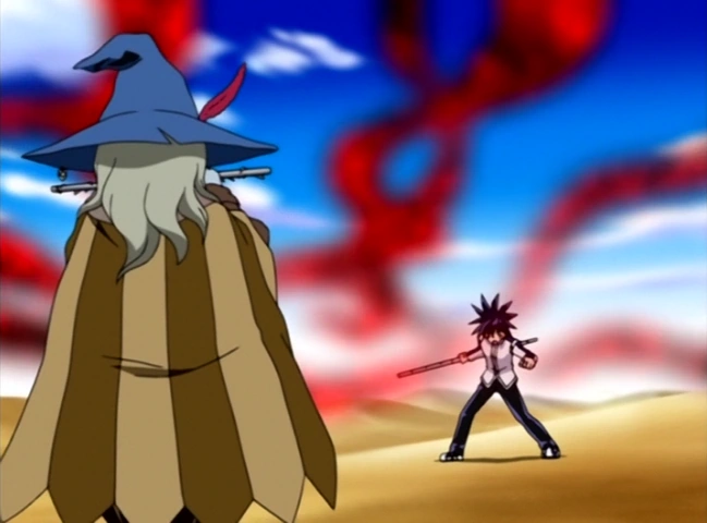 Kouga then explains why pretty boys like Alviss disgust him and he removes his mask revealing his ugly face. Kouga comments that because he is ugly he has an overwhelming desire to kill people like Alviss who were blessed with good looks. Alviss sneers at Kouga and comments that Kouga is ugly in boy face and heart and that he deserves to die. This enrages Kouga who once again attacks Alviss with his Centipede weapon. Alviss closes his eyes and thrust his Totem Rod right through the center of the Centipede destroying it instantly surprising Kouga. Alviss then slams the Totem Rod into the ground and extends it lifting Alviss out of the Sand Hell quicksand and onto solid ground.