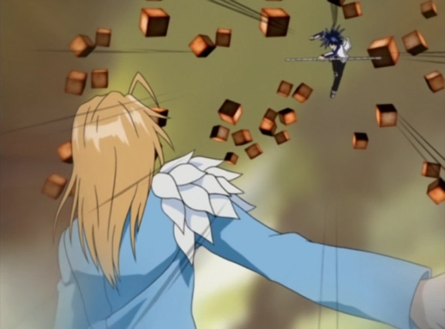 Alviss equips his Rod and charges at Rolan, only for the latter to effortlessly dodge and deflect each attack with his feet. He then knees Rolan in the groin. Alviss declares his belief that humanity is to spend a limited lifetime with with one's dearest person. Rolan disagrees, claiming it's better to spend an endless amount of time with said dearest person. He leaps back to toss more Stone Cubes at a much faster speed than previously. One Stone Cube manages to knock the Totem Rod out of his hand, and Rolan urges him to reconsider as eternal life meant also being free from pain of losing those who would be dear to him. Alviss, realizing that Rolan was still grieving his parents' deaths and didn't want to ever part with Phantom, holds his ground and punches the last Stone Cube away with his fist. Rolan then leaps up in the air to activate his Nature ÄRM, Aile D'ange. The feathers on his shoulder becomes a pair of wings that lift Rolan off the ground and warns Alviss that he'll die with the next attack. Rolan launches a multitude of feathers from his wings at Alviss who defends using Guardiss.