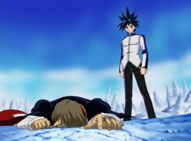 Alviss kneeling in the middle right in episode 5 of Kekkaishi.