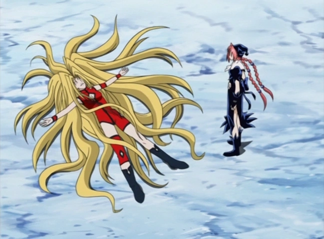 Everyone is worried for Dorothy when they notice she has has blocked the spikes from sandwiching her with the Zephyrus Broom then shatters the spikes with a blast of wind from her ÄRM. Rapunzel meanwhile comes to the realization that Dorothy is a wind master. Rapunzel then ask whose mastery is strong, ice or wind and attacks with another wave of spikes. Dorothy easy counters this with another swing of her broom reducing the spikes to rubble once again. Dorothy say it's too bad and that the spikes didn't reach her. Then Dorothy sends out a small blast of wind that cuts Rapunzel's face. The cut on Rapunzel's "beautiful" face causes her to lose herself in anger and attack Dorothy with intent to kill.