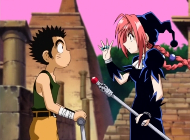 While flying over Pazurika Island in search of the Cave of Babbo, Dorothy sees a boy named Ginta running wildly in the fields below. Thinking he may have found a rare ÄRM, she decides to test him by summoning her Guardian ÄRM, Ring Armor, and have it attack him while she watches from a rock pillar. Ginta grabs the suit's torso and, with a bit of effort, sends the armor flying back. Utterly shocked by his apparent strength, he hears clapping and looks up on a rock pillar to see the pretty witch applauding him.
