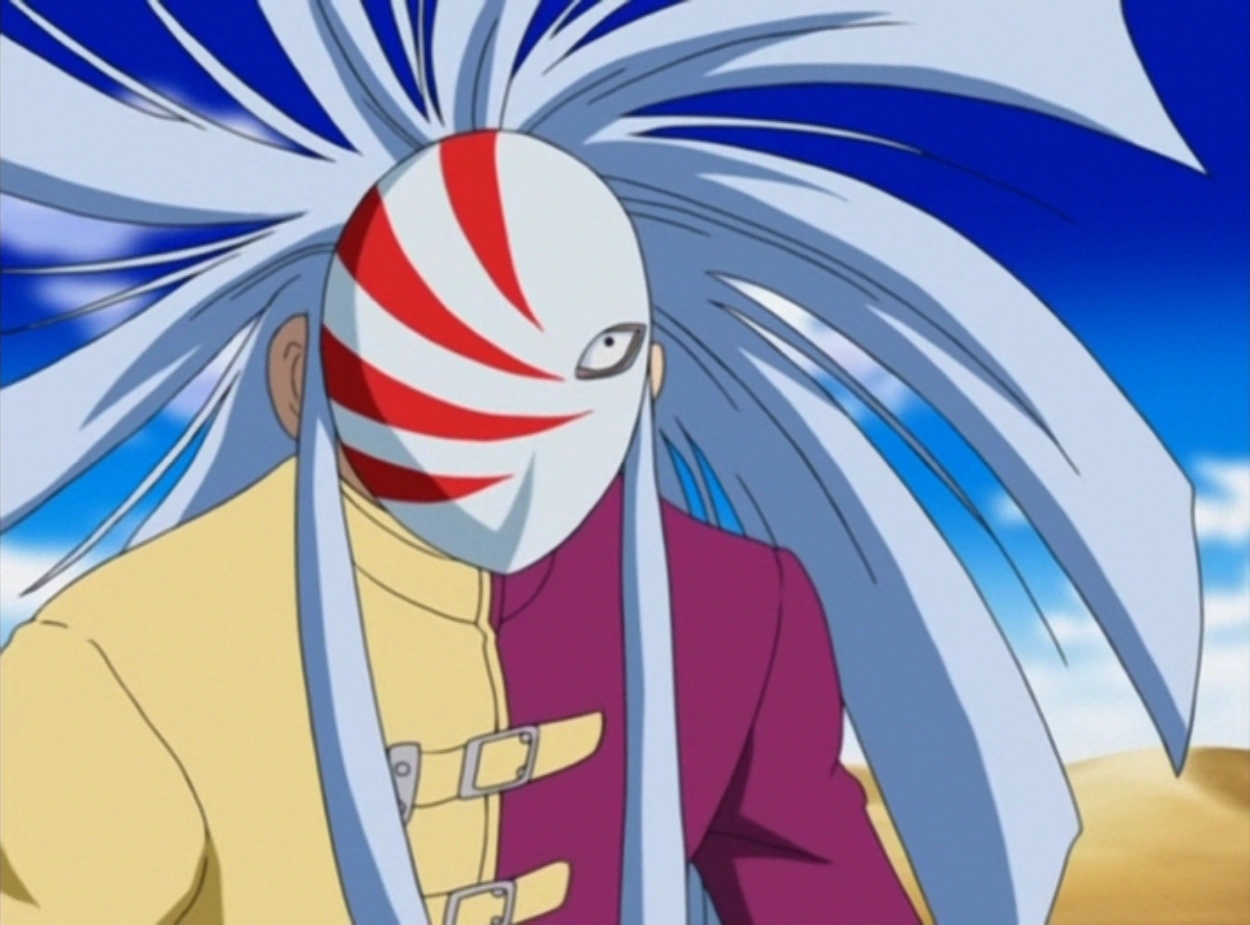 Fuugi is a man who has wild, windmill like hair, wears a mask with an eye hole on the left side and four red, scratch-like markings on the right side. He wears a jacket that is tan on one side and purple on the other fastened with four straps in the center. His pants share the same color scheme but the colors are on the opposite side. On his belt line are several strips that have writing on them.