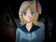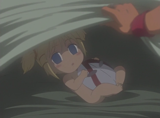 When Chaton wakes up in Alan's arms, she initially assumes he saved her, but he gives credit to Loco as they both look up to where she stood. Realizing what Loco did in spite of the consequences of her Darkness ÄRMs, she ascends the stairs to find Loco's clothes and open suitcase. Fearing the worse, her hand shakes as she slowly lifts up the dress, and thankfully finds Loco still exists, albeit having been reduced to an infant. Unable to contain her emotions, she cries as she holds Loco in her arms. Alan tries to comfort her from her guilt over Loco's sacrifice, but she quickly changes her mood at the thought of her and Alan becoming Loco's new parents, much to Loco's dismay.